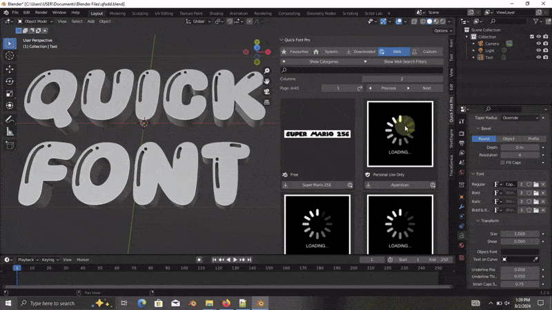 Quick Font Pro V1.3 这是一款适用于 Blender 的字体管理插件,可在软件内直接浏览、搜索并下载超过 87,000 款在线字体。
