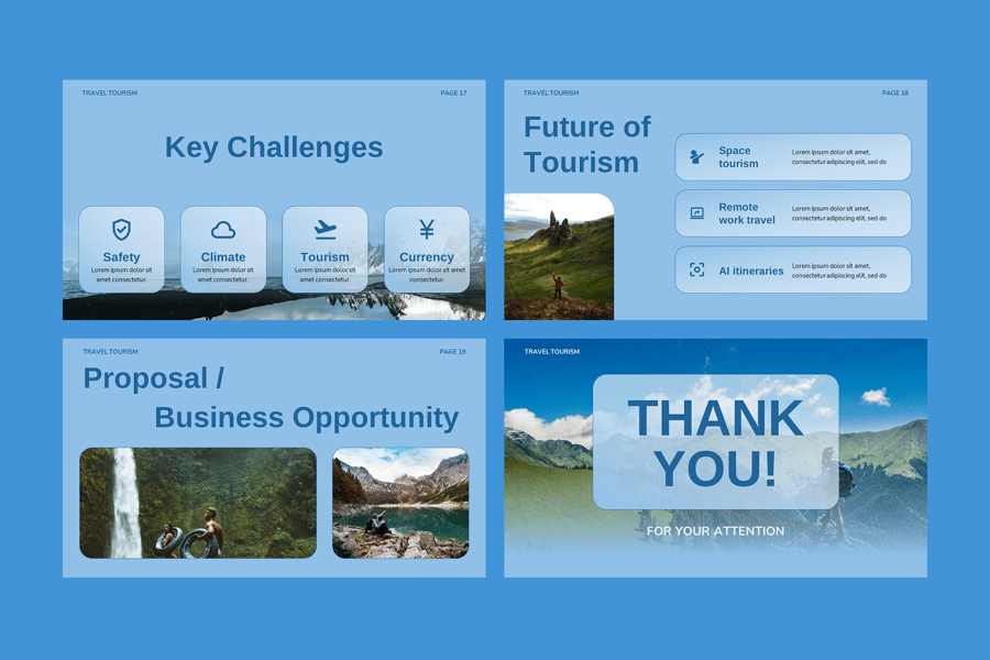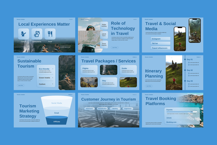 凭借独特的幻灯片、完全可编辑的元素和基于矢量的信息图表,这款模板是制作引人入胜的旅游推介、旅游商业计划书或宣传资料的完美之选。